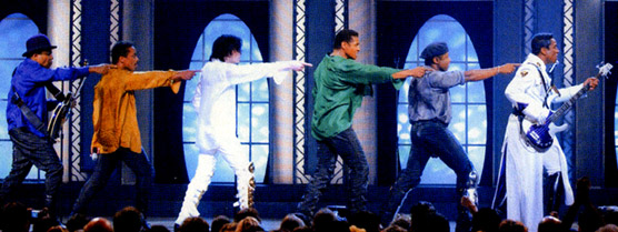 Sur la photo on les voit reproduire la célèbre chorégraphie de Shake Your Body. De gauche à droite: Tito, Marlon, Michael, Jackie, Randy et Jermaine. |
